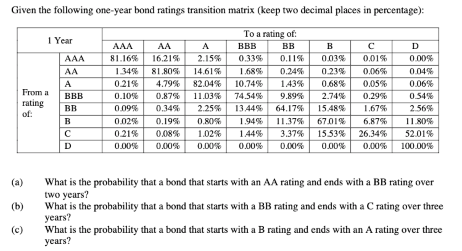 Solved Given The Following One Year Bond Ratings Transition Chegg Com